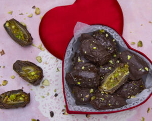 Chocolate Coated Dates stuffed with Tahini Pistachio Paste